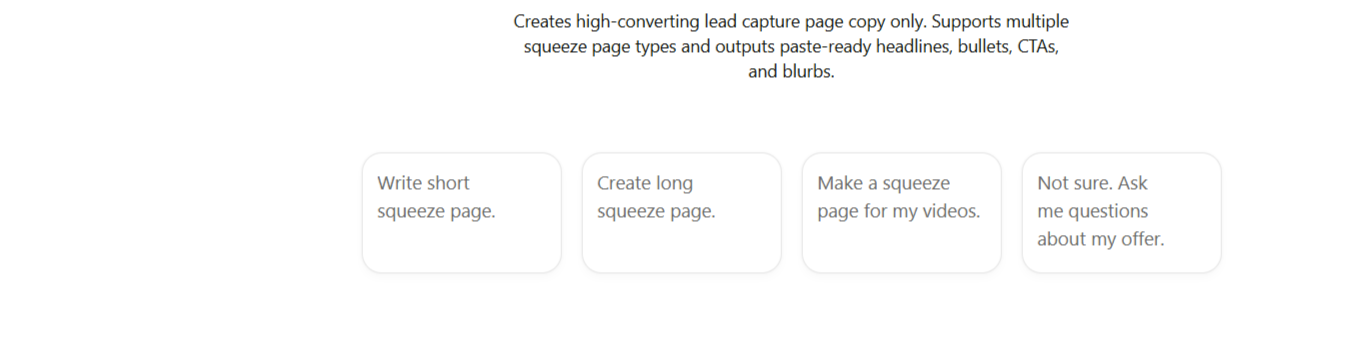 Instead of staring at a blank page and guessing what to write, your buyers can fire up a GPT, answer a few targeted questions, pick a page style, and walk away with a finished squeeze page they can paste into their funnel right now.