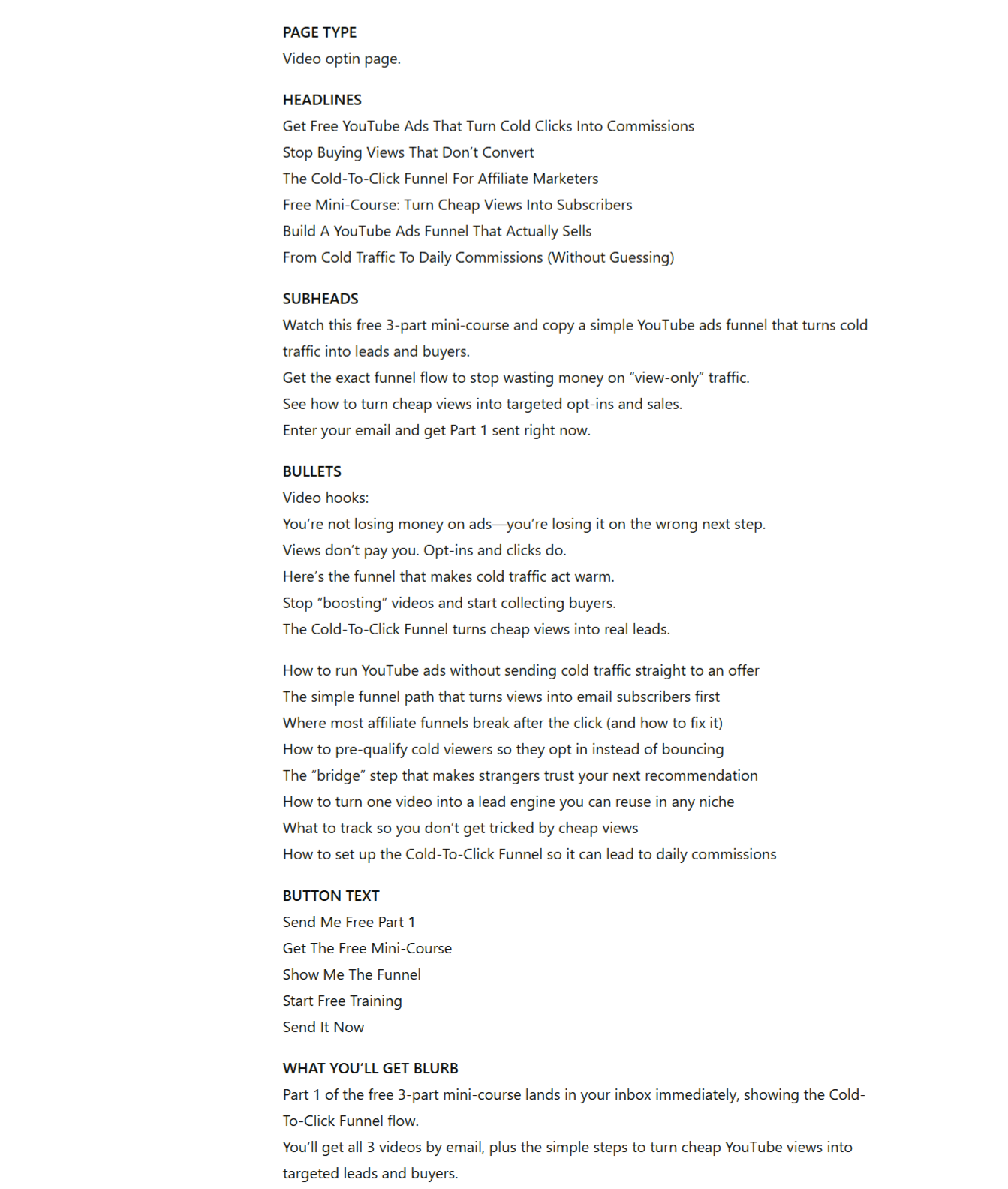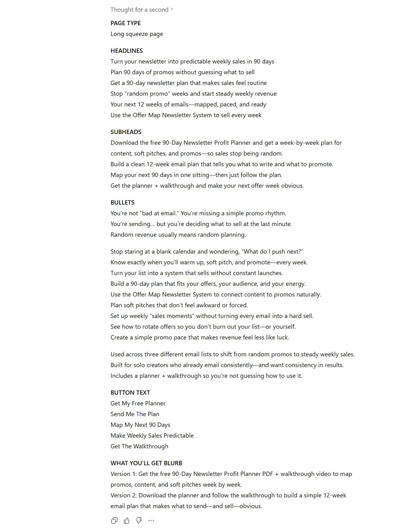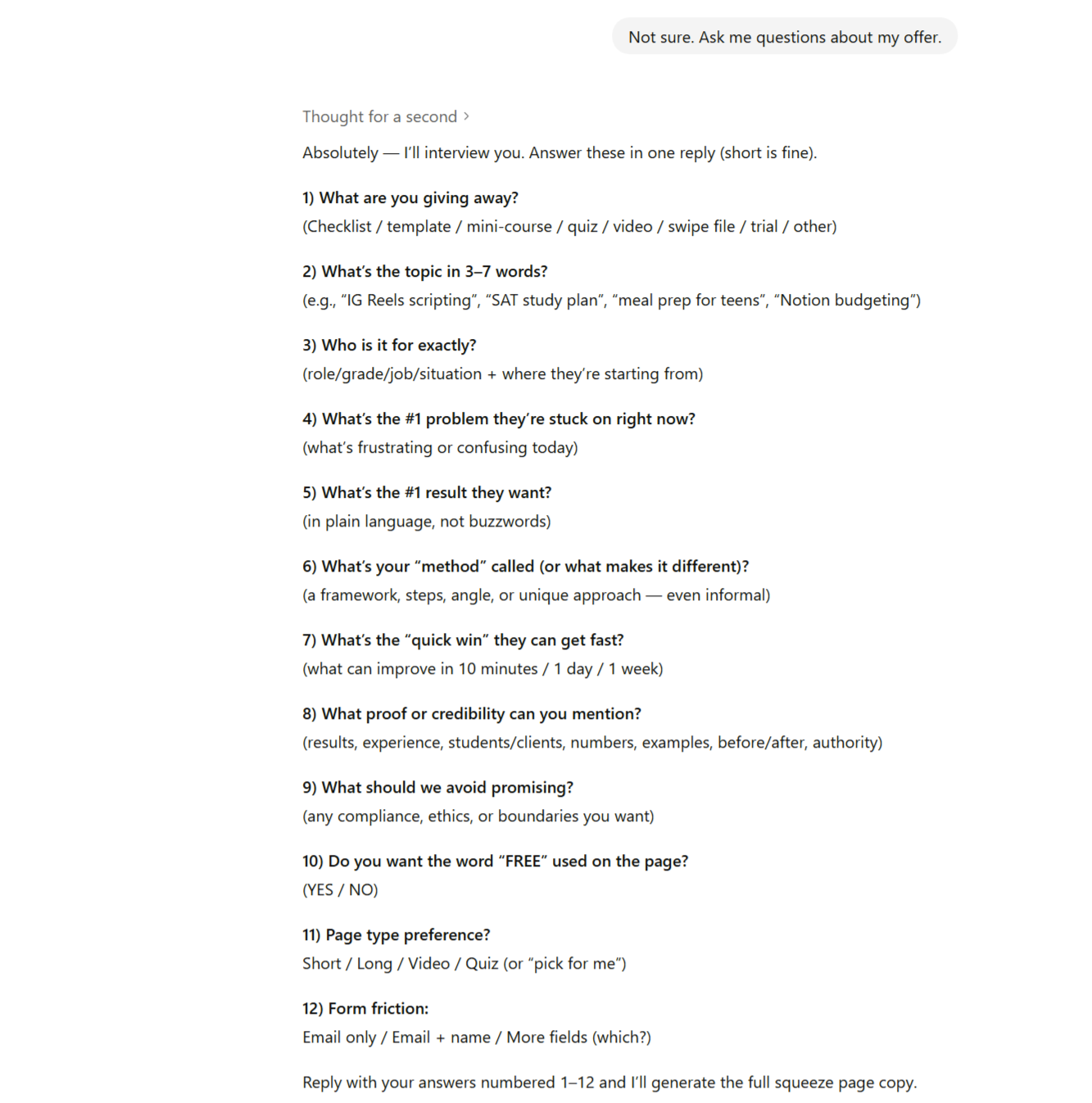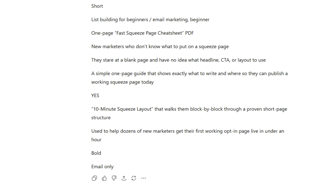 They go from “I don’t even know how to start this page” to “I’ve got a full squeeze page draft I can paste and tweak” in one run.