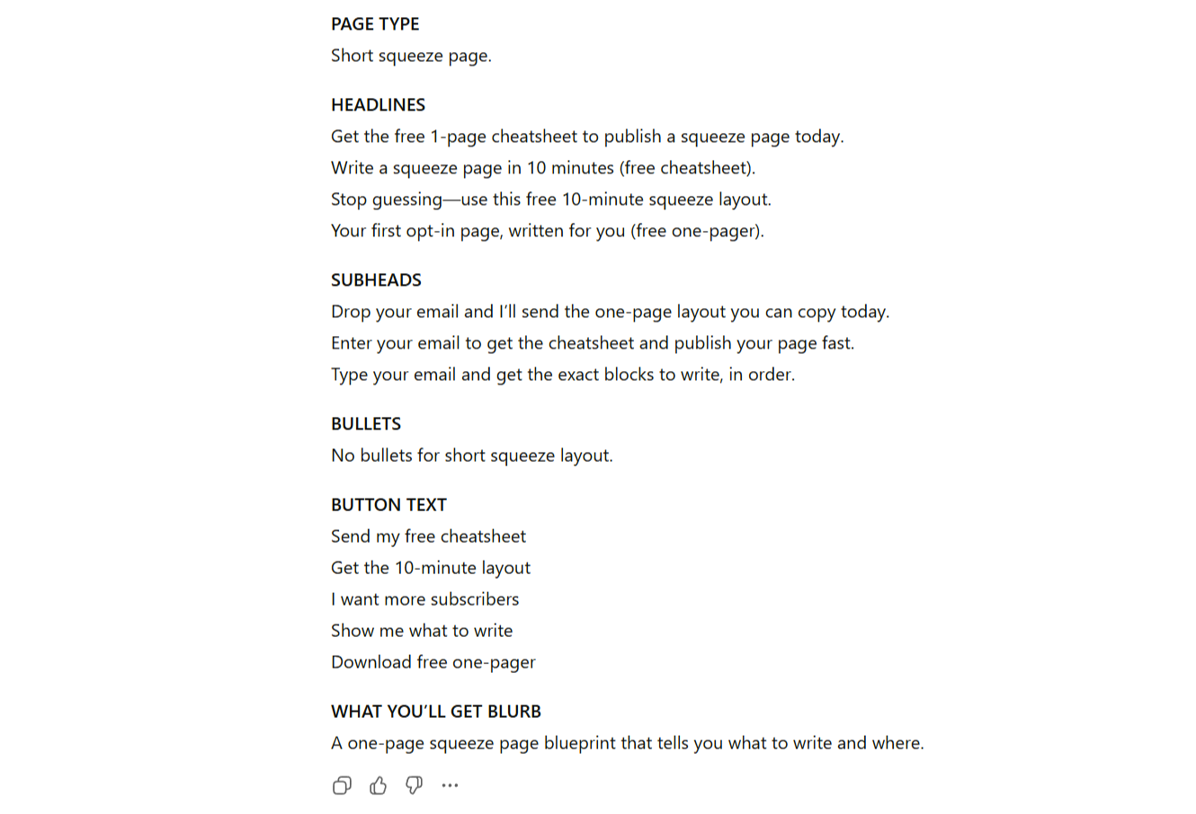 Then the GPT uses your instructions to output structured squeeze page copy, section by section: