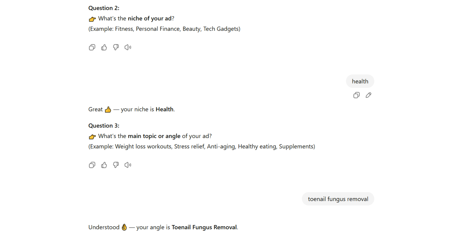 It guides you through a simple step-by-step process, asks the right questions, and delivers compliant, high-impact ad copy with scroll-stopping creative suggestions.