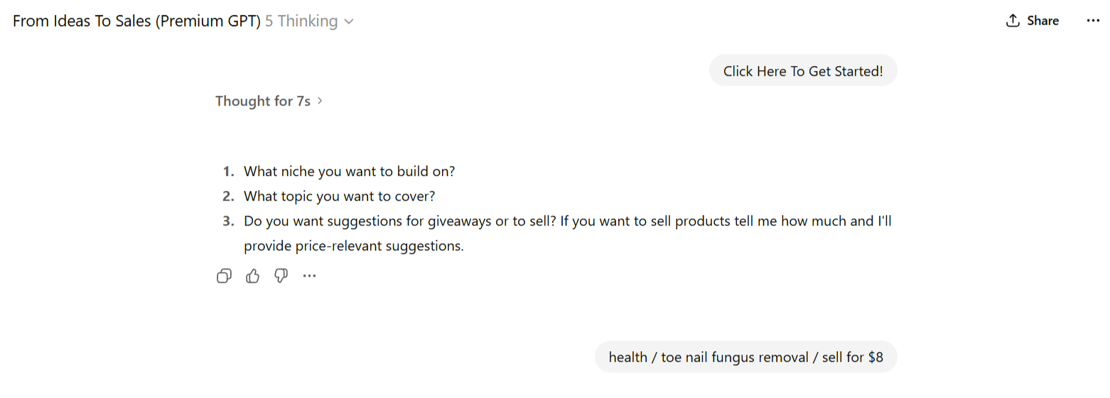 Now picture this: instead of hours of trial and error, your own GPT—set up for a single, laser-focused task—delivers exactly what you need in seconds. Crisp. Consistent. Reliable. No hand-holding, no rewrites, no frustration. While others are still wrestling with prompts, you’re already done and moving on to your next win. That’s the power difference between using only ChatGPT versus 'From Ideas To Sales' Premium GPT.