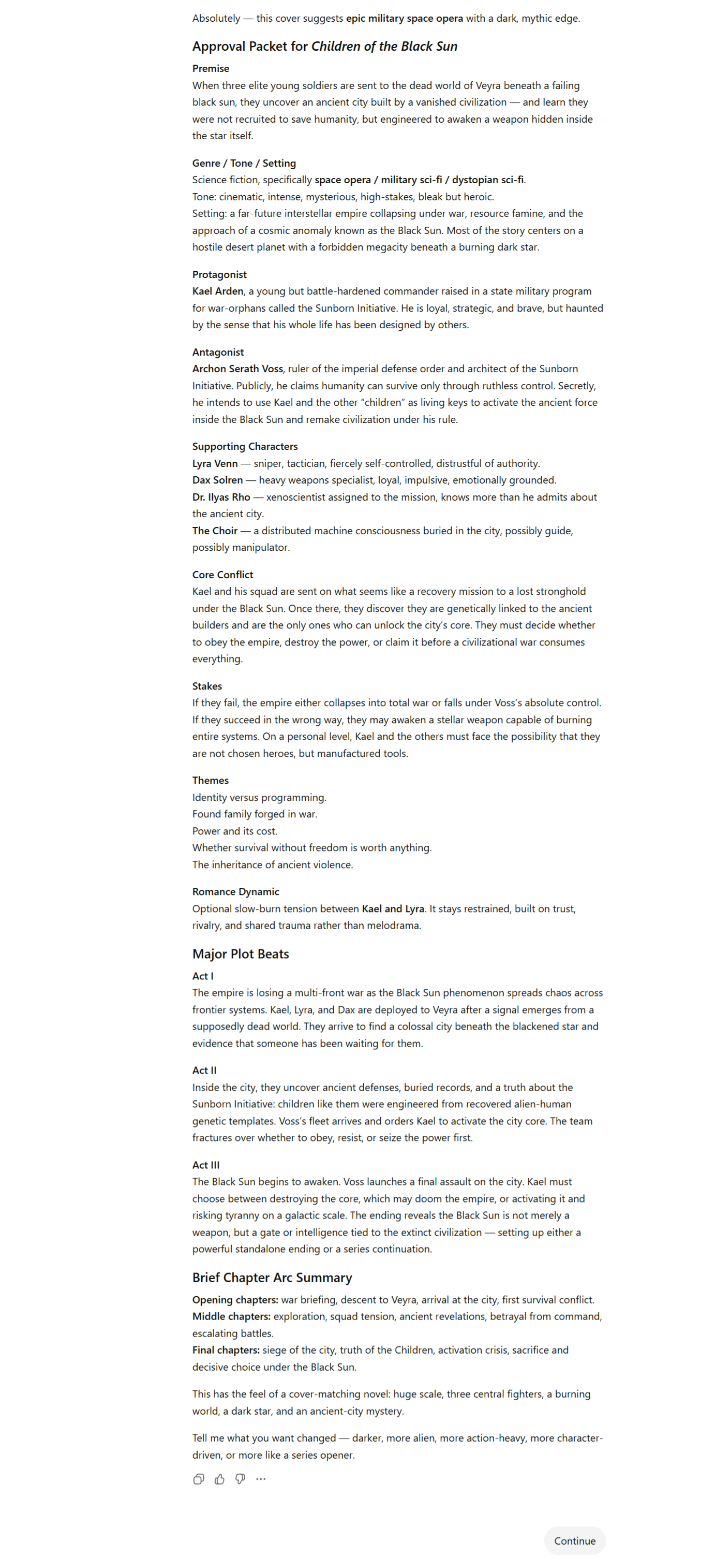 This excerpt is a very strong sci-fi opening with major commercial appeal. Its biggest strengths are atmosphere, cinematic imagery, worldbuilding confidence, and tonal control. The sample feels like a serious space opera with mystery-thriller propulsion, and it matches the promise of the cover extremely well. What stands out most is that it does not feel generic. The Black Sun, the ancient city, the Sunborn reveal, and the gate mythology all give it a memorable identity.