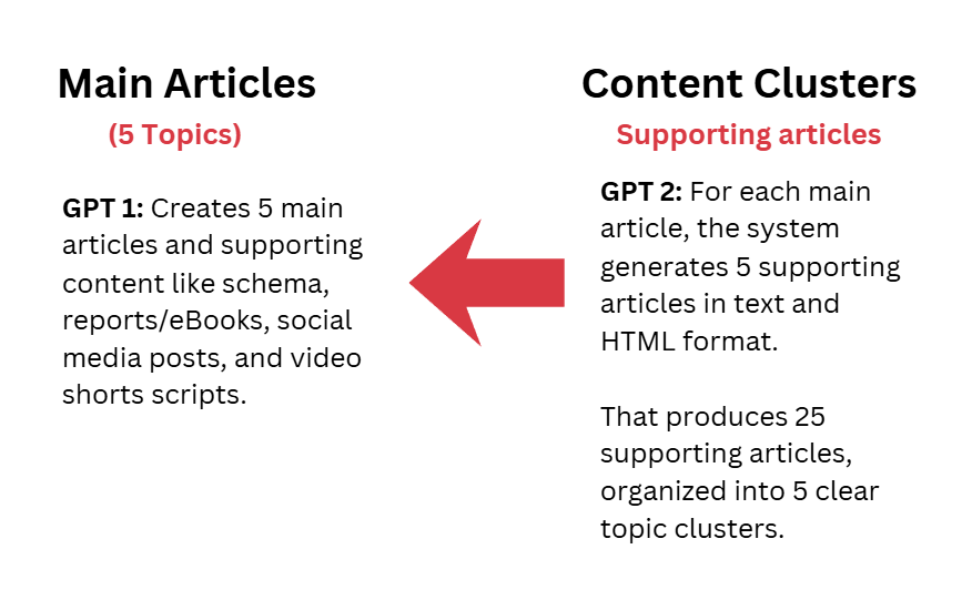 GPT #1 creates the articles and the supporting content.