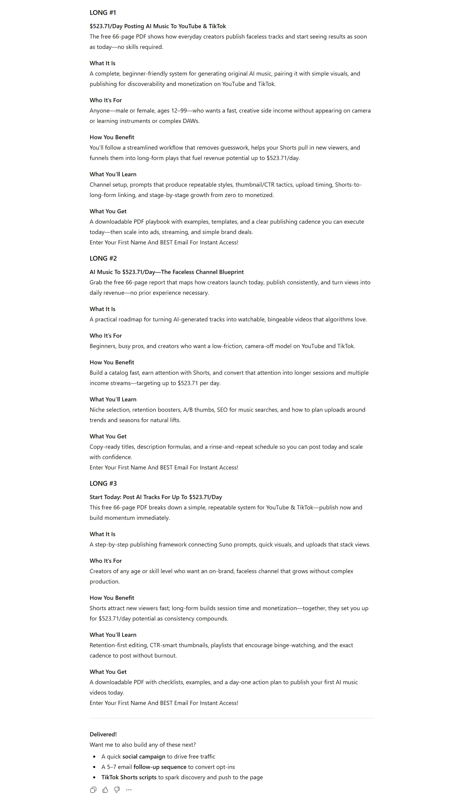 Once that page copy is dialed in, you can ask it to generate all the supporting content around it: nurture emails, landing sections, social posts, video shorts scripts, value assets like ebooks, reports, checklists, all aligned perfectly with that lead offer. No gaps, no confusion, just one clear conversion path.