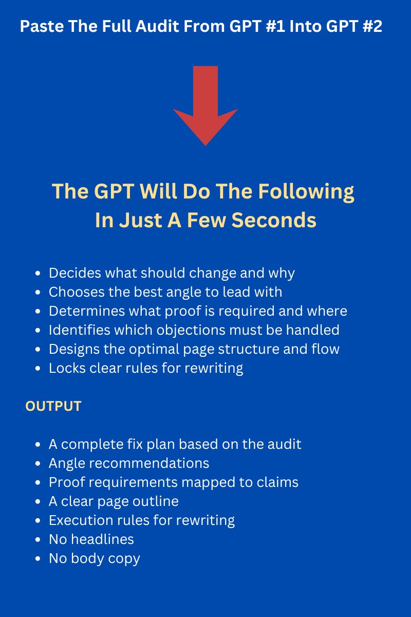 GPT 2 takes the audit and turns it into a fix plan you can execute before launch. It decides what should change and why, what angle should lead, what proof is required, and what structure needs to shift so the page flows and persuades properly. It does not write full copy.