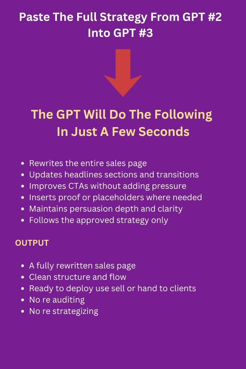 GPT 3 rewrites the entire sales page using the approved strategy. That includes headlines sections CTAs proof placement and flow. It executes the plan. It does not re audit and it does not change strategy.