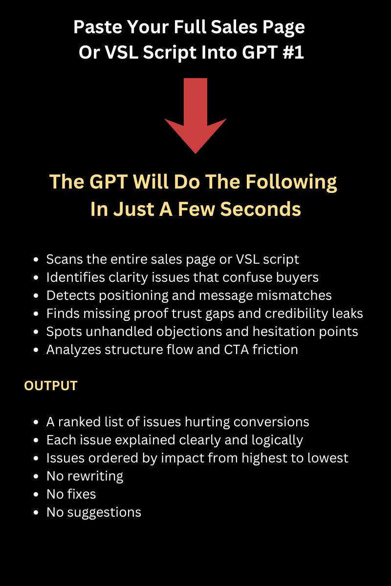 GPT 1 audits the sales page and finds what is likely to reduce conversions once traffic hits. It ranks issues by impact so you know what matters most first. It does not rewrite or tell you how to fix anything.