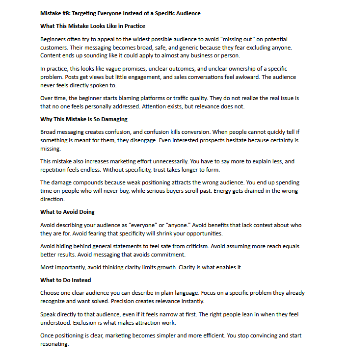 Sales and offer mistakes are covered with equal depth. Readers learn why weak offers, pricing fear, ignored objections, and avoidance of selling stall income. The material reframes selling as clarity and alignment, not pressure.