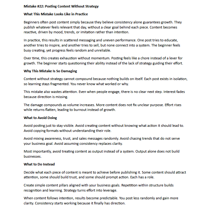 Traffic and marketing chapters address common visibility traps. These include overreliance on single platforms, chasing virality, ignoring list building, and posting without strategy. The emphasis stays on stability, ownership, and conversion-focused growth.